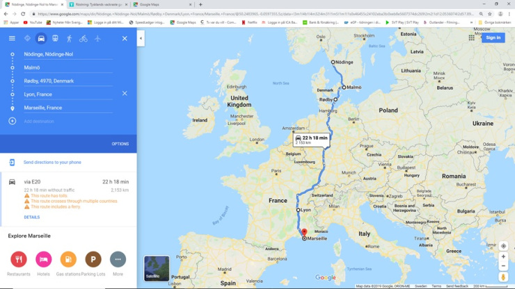 Vi börjar vår resa med att köra ner mot Danmark. Första natten blir säkerligen i Sverige. Därefter kör vi vidare via Öresundsbron och Rödby – Puttgarden. De första 100 milen går mot Tyskland och Rhendalen. Här blir det nog ett par stopp. Vi hoppas kunna ta oss fram med våra nya cyklar vilket kan ge tillfälle till lite provningar här och där. Målet är som ni kan se Franska Revieran och då Provence.