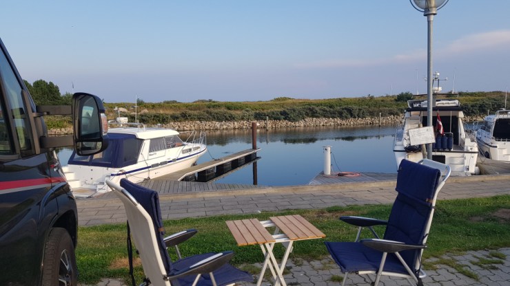 Använder vårt Bropass och kör över Öresundsbron mot Greve Marina, strax söder om Köpenhamn (36 mils körning idag). Underbart väder, vi tar en promenad i de vackra omgivningarna. Sitter ute länge. Sedan kommer ovädret – regn, åska och dunder. Vaknar vid 1-tiden av att kylskåpet piper. Ingen ström. Michael går ut och fixar och vi lägger oss igen. Efter en halvtimme är det åter dags – strömlöst och det går inte att fixa denna gången. Sätter kylen på gasol, det funkar inte heller. Läser instruktionsboken, googlar och trycker på knappar. Vid 3-tiden kommer Michael på hur man ska göra och vi kan äntligen gå och lägga oss igen. På morgonen kan vi konstatera att det inte är fel på våra kablar eller något i husbilen. Det visade sig att man skulle sätta i ett kort i elstoplen och det hade vi missat L. Vi lär oss nog så småningom.