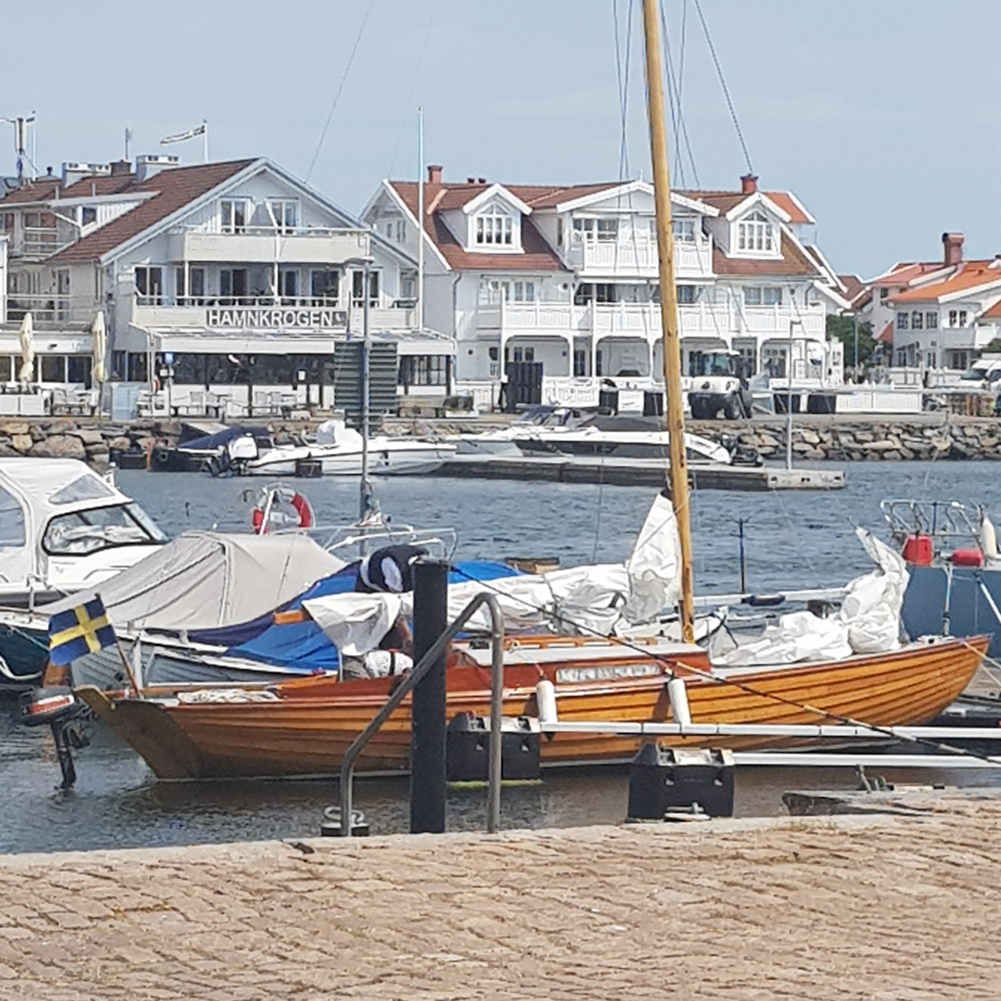 Vi testade Henåns ställplats, den ligger fin mitt i byn. Många fina båtar i hamnen. Vi tog en promenad runt byn och Anette fick inhandlat en fin sommarjacka.