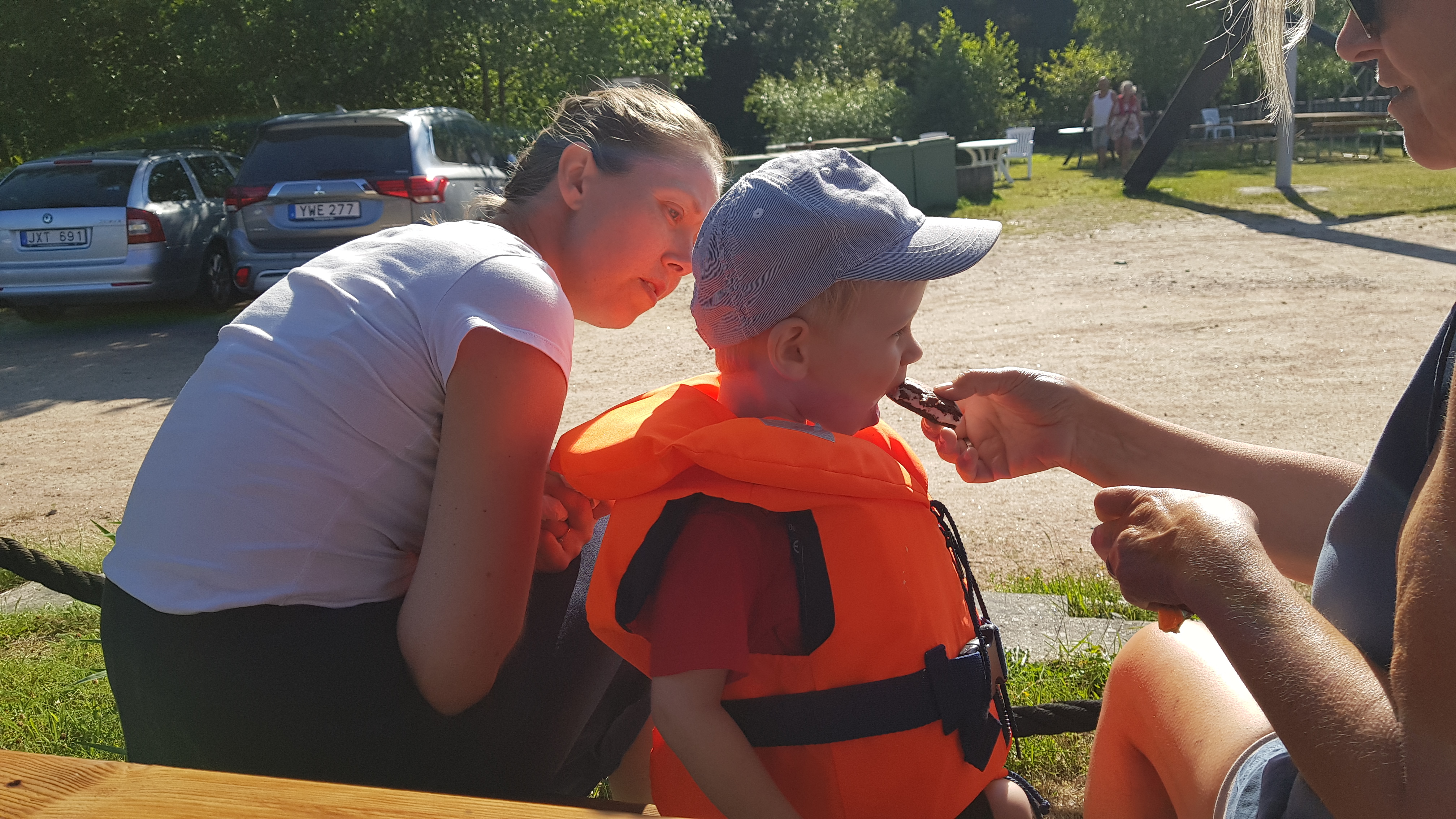 Emma, Jonas och Alvin lånar Edit och är på Stockens camping några dagar. Vi kör först dit Edit och hämtar henne sedan för att åka till Vindön. Emma och Jonas tältar. Fortfarande varmt och skönt väder.