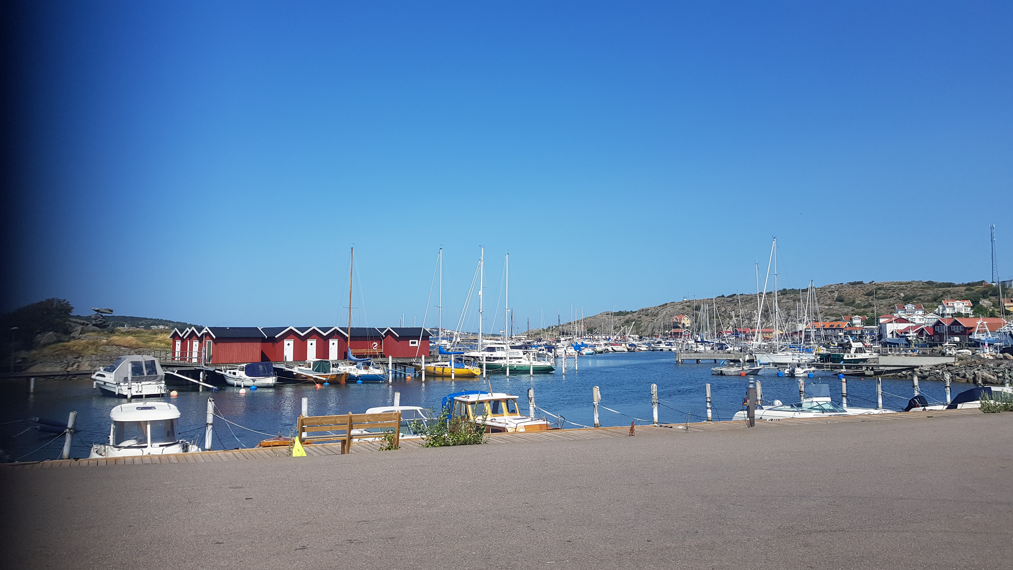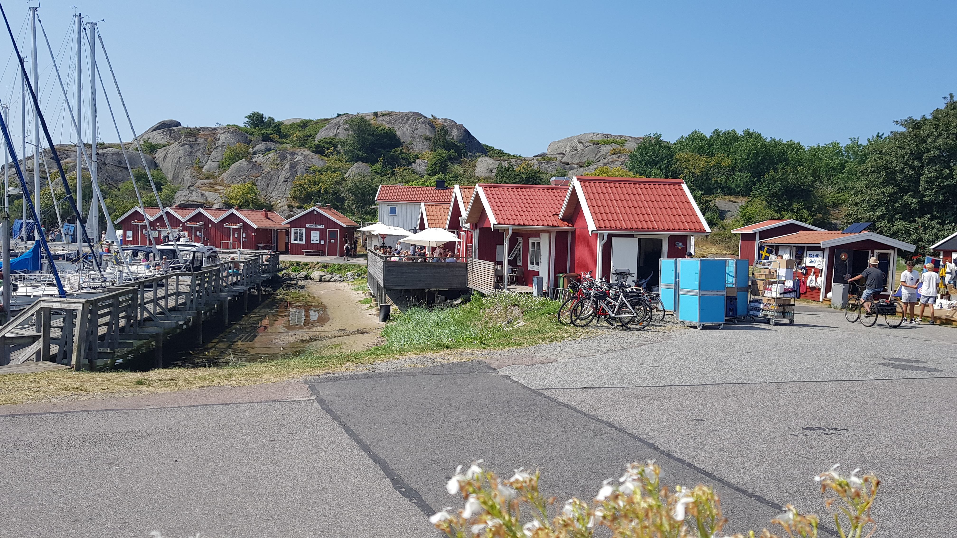 Det var fullt på Hälsös ställplats så det blev i stället en liten båthamn på Öckerö. Cyklar och hälsar på Lilian och Stefan på Hälsö.