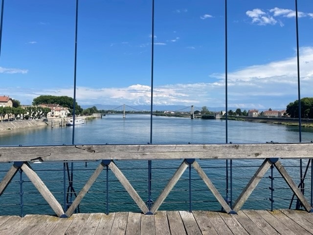 Frisk luft på morgonen den 5 juni när vi lämnar Nuits Saint George. Fortsätter ca 26 mil söderut ch hamnar återigen i ett fruktansvärt regn- och åskoväder vid dagens slutmål Tain – l`Hermitage, Camping <les Lucs. Upptäcker på vår promenad att vi kommit till en riktig turistort. På andra sidan Rhone ligger Tournon-sur-Rhone och där finns många barer, restauranger och turister. Vi gick dit för att äta men har inte lärt oss de franska sederna ännu. Att äta vid 17-tiden går inte, då gäller glass eller olika drycker, ingen mat. Den serveras först vid 19.30-tiden nån gång. Vi fick gå tillbaka till Edit och tillaga vår semesterklassiker – stekt bacon och pasta. Smakade ljuvligt! Dessutom är vädret fantastiskt med sol och härlig värme.